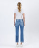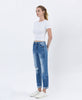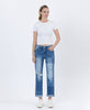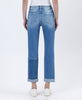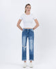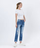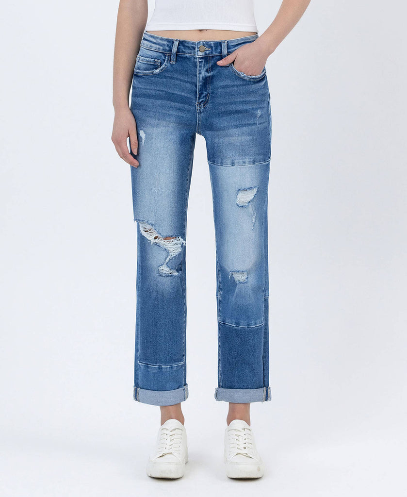 HIGH RISE COLOR BLOCK CUFFED BOYFRIEND JEANS COMFORT STRETCH DENIM, HIGH RISE WASIT, DISTRESSED DETAIL, COLOR BLOCK PATCH, DOUBLE CUFF HEM