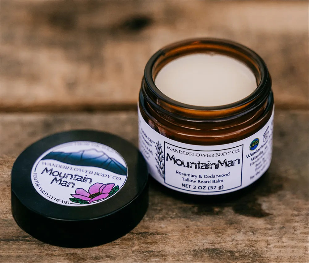 Alaskan tallow beard balm infused with horsetail and yarrow, plus a woodsy essential oil blend